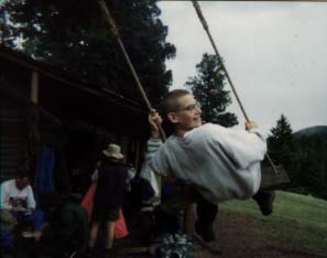 Crooked Creek: David enjoys the large tree swing outside the Crooked Creek cabin.
